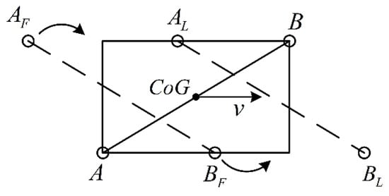 There are always two legs moving in the same phase for most dynamic gaits; hence, these two legs can be equivalent to one virtual leg from the midpoint of the support line to the robot’s CoM. The stability criterion is considered in the current virtual-support plane. and are the projection points on the support plane of the next set of support feet, and , respectively, as shown in Figure 4.