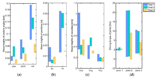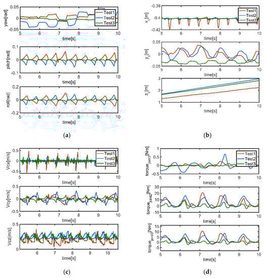 As shown in Figure 19, the motion of Test 3 was the steadiest and required the minimum joint-driving torque, and the stabilities of the other two tests were about the same. In fact, stability cannot be evaluated accurately using individual-sensor data, which is one of the reasons the stability criterion and measurement must be proposed.