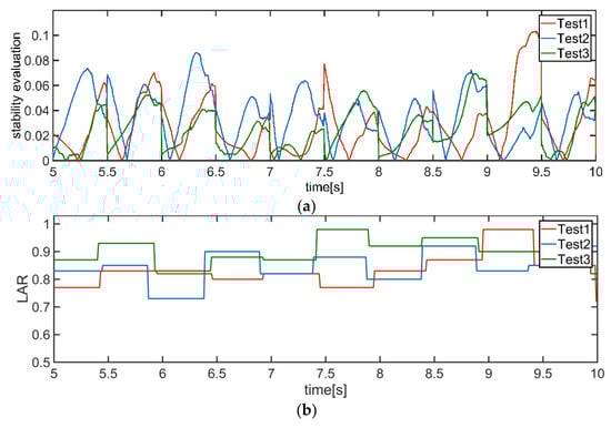 The generally accepted stability-evaluation method (denoted as Method 1), i.e., the one that measures the distance between the traditional ZMP and the current support line; LAR (denoted as Method 2); and the proposed stability measurement for the trot gait of a quadruped robot (denoted as Method 3) were used to evaluate the stability of the three tests (Figure 20a–c).