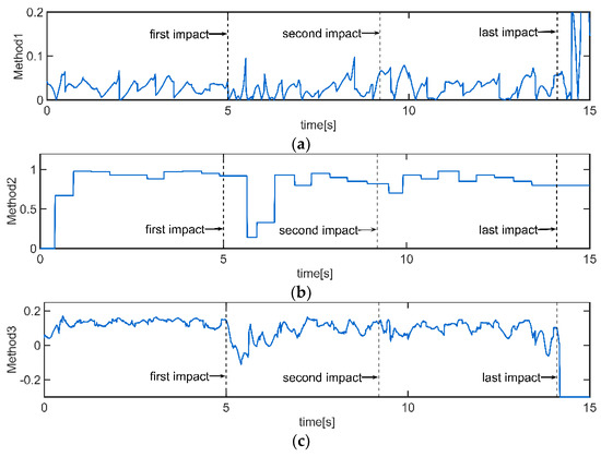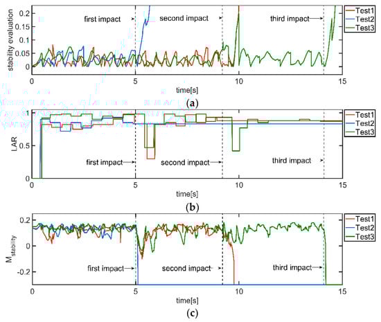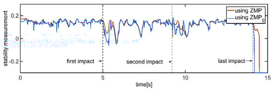 The three stability-evaluation methods were also used for the analysis of the three tests with external impacts. To illustrate this intuitively, for Method 2, the stability measurement was set to −0.3 if ZMP0 was outside the virtual-support quadrilateral and the robot lost its balance according to Equation (40).