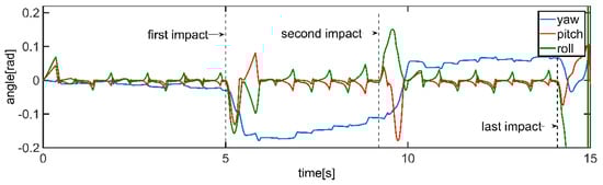 The changes of the posture angles of these two tests under impacts are shown in Figure 22.