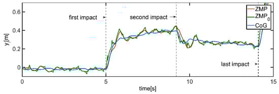 Test 2 was the least able to bear the impact force in the positive direction of , since the positions of the next set of support feet differed with respect to ZMP0 (as can be seen simply from the positions of the next support lines with respect to CoG), tumbling after the first impact (Figure 23b). The robot walked stably in Test 1 until the second impact was applied to the body (Figure 23a), and the robot in Test 3 lost its balance after the last impact (Figure 23c).