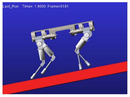 Simulation 3 was designed to prove that the stability-evaluation method proposed in this paper is also applicable to the motion of a robot in 3D space (Figure 29). The robot moved on a 12° slope as shown in the animation (Video S3), and the body’s trajectory was similar to that used in Test 3 of the previous simulation: CoG started to move from the midpoint of the current support line to that of the next support line at a constant speed when the previous support line had just disappeared. The contact parameters between each foot and the ground and the trot-gait parameters of this simulation were set to be identical to Test 3.