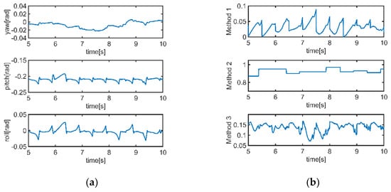 The attitude angles of the principal-axes coordinate system, and the variation of the stability measurements calculated using above three methods with time are shown in Figure 30a,b.