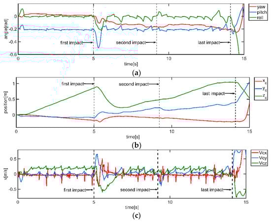 Sensor data of the motion with impact in Simulation 3: (a) posture angles of the principal-axes coordinate system; (b) positions; and (c) velocities of the body.