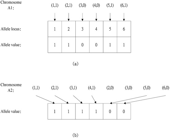The fmGA is based on messy genetic algorithms (mGAs). The chromosome of the fmGA is divided into allelelocus and allele values. The allelelocus represents the allele number, and the allele value is the numerical value of the allele number. Figure 2a shows the chromosome complement of fmGA. In addition, the fmGA does not fix the chromosome length, as it can handle the over-specified chromosome after the cut-splice operation [12]. If a chromogene is over-specified (Chromosome A2), then the fmGA uses the first-come-first-serve rule of browsing from left to right to screen the repeated allele value (final allele value of Chromosome A2 is 111100), as shown in Figure 2b. The major difference between fmGA and the traditional genetic algorithm is that fmGA uses a variable string length, and the allelelocus and allele values can evolve simultaneously, which is suitable for handling high netting variability. The Taguchi analysis sheet of different level factors is optional.