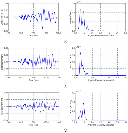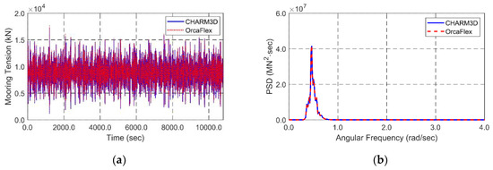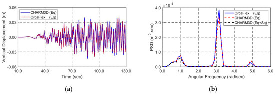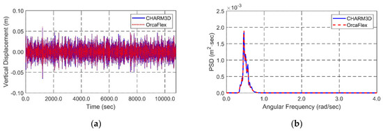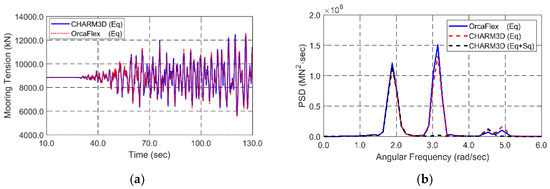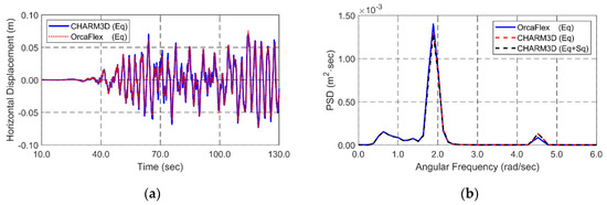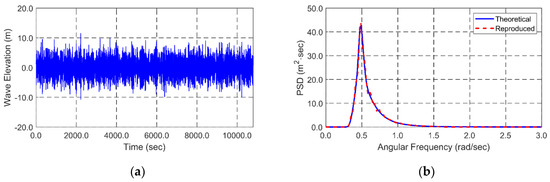 Simultaneous random-wave and seismic excitations are considered for global performance analysis. The same wave and seismic time histories are inputted in both programs for cross-checking. JONSWAP wave spectrum is used to generate time histories of random waves. Significant wave height and peak period for the 100-year-storm condition are 11.7 m and 13.0 s. Enhancement parameter is 2.14 that is the average value in Korea [45]. Random waves are generated by superposing 100 component waves with randomly perturbed frequency intervals to avoid signal repetition. The lowest and highest cut-off frequencies of input spectrum is 0.3 rad/s and 2.3 rad/s, respectively. The wave direction is perpendicular to a longitudinal direction of the tunnel. A 3-h simulation is carried out to analyze the statistics of dynamic behaviors and mooring tensions under the storm condition. Figure 3 shows theoretical JONSWAP wave spectrum and the reproduced spectrum from the time histories of wave elevation. It also shows the time histories of wave elevation produced by the JONSWAP wave spectrum.
