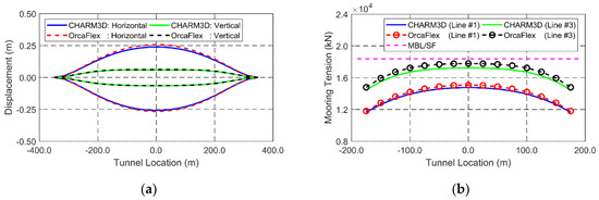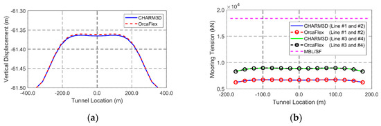 Submerged floating tunnel (SFT) vertical displacement (a) and mooring tension (b) in the static condition.