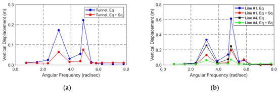 Amplitudes of vertical displacements of the tunnel (a) and mooring line #1 (b) at the middle location under regular seismic excitations of various frequencies (Eq: earthquake only considered; Eq + Sq: both earthquake and seaquake considered).