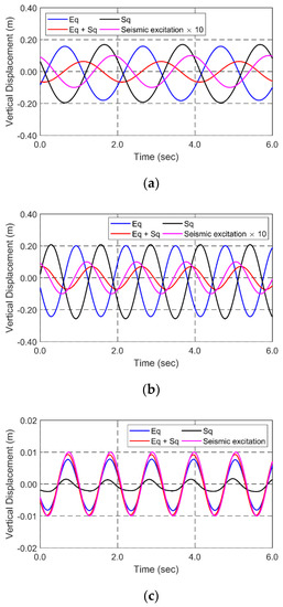 Time histories of vertical displacements of the tunnel at the middle section by respective force components under regular seismic excitations of 3.12 rad/s (a), 4.89 rad/s (b), and 5.78 rad/s (c) (Eq: earthquake only considered; Eq + Sq: both earthquake and seaquake considered; Sq: seaquake only considered; time histories of seismic excitations are multiplied by 10 for better visualization).