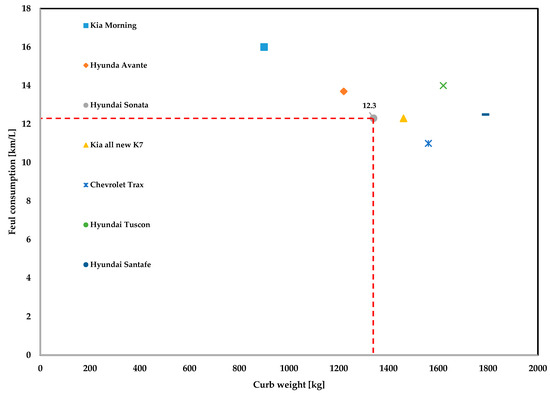 Among factors that cause the difference between fuel consumption that is experienced by a driver and certified fuel economy, the study focused on factors of accumulated mileage of the vehicle, as well as different unadjusted and adjusted fuel consumption formula. Moreover, since little attention has been paid to relationship between vehicle’s operating condition and aging engine, we investigated the change of CO2 around the selected accumulative mileage: 0 km, 6500 km, 15,000 km, and 30,000 km during the FTP-75, HWFET, and US06 driving cycle. Also, the detailed factors that contribute to aggravating fuel consumption as the engine has aged was additionally investigated in US06 drive cycles. Finally, based on the empirical formulae developed by the results of the vehicle-specific 5-cycle fuel economy values measured at 6500 km, 15,000 km, and 30,000 km mileage, the aggregation of fuel efficiency results was estimated within 100,000 km mileage. Figure 1 shows the difference of fuel efficiency values according to the weight of vehicle. Among these cars, a Sonata with intermediate weight and fuel efficiency was selected as the experimental vehicle in this study.