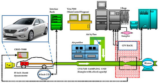 Figure 2 shows a chain diagram of a chassis dynamometer and an exhaust gas analyzer that can measure exhaust gas and the fuel efficiency of a vehicle. The chassis dynamometer simulates running resistance and inertia resistance corresponding to running speed and acceleration of an automobile. The chassis dynamometer that was used in this test is an AC dynamometer of AVL. It is composed of inertia weight, power absorption unit, and controller. Table 2 shows details of the specifications of the test vehicle used in this study. The vehicle was operated on the chassis dynamometer along driving modes, and real-time exhaust gas and vehicle data were obtained for a prescribed speed trace of each driving cycle. Vehicle emissions measurements were made with CVS tunnels and exhaust gas analyzer (MEXA-7 series). The result of the vehicle emissions was analyzed by inspecting the trapped bag containing exhaust gases. Test modes that were used in this study were the FTP, HWFET, and US06 driving cycles, and experiments were performed under the following conditions. The test of these driving cycles was performed in the test room maintained at constant temperature of 25 ± 1 °C and constant relative humidity of 50 ± 5%. The FTP-75 mode was tested by soaking the test vehicle for more than 12 h under test temperature conditions, and the HWFET and US06 modes were tested in the preconditioning mode, which serves to warm up the engine to maintain the vehicle at a constant temperature.