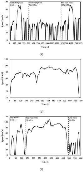 The FTP-75 cycle is shown in Figure 3a. The cycles are introduced to simulate the urban way. Characteristics of cycles are described with distance traveled, 17.77 km, duration 1874 s, and average speed 34.1 km/h. As seen in Figure 3a, the FTP mode can be separated into three regions with different operating conditions. The first phase in the range from 0~505 s is called the cold start phase. Since the engine does not start until the FTP cycle begins, it is relatively colder than in other phases. The cold start phase is followed by a second phase, called the transient phase, that plays the role of warming up the engine. In the third phase, called the hot start phase, the vehicle is driven along the same trace as the first phase region.