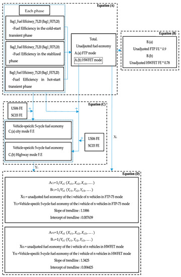 Figure 4 demonstrates the flow chart of fuel consumption equations. This flow chart indicates how each of fuel consumption equations are related with each other. Table 3 shows the one unadjusted and three adjusted fuel consumption equations. Equation (A) which calculates the unadjusted fuel consumption is divided into two processes. The first step is to obtain each emission concentration of HC, CO, and CO2, through Equation (a) required for mass of emission discharged during a specific stage of one cycle. Next, the concentrations of each emission calculated through Equation (a) and characteristics of fuel are substituted into Equation (b). Then, unadjusted fuel consumption for LPG can be produced for each 5-driving cycles. The reason why the equation is called an unadjusted fuel efficiency formula is that no adjustment factors are applied. Also, it should be noted that Equation (b) is only applied to vehicles that are fueled by LPG. The first Equation (B), of three adjusted fuel consumption equations had been used until 2007. The Equation B for fuel consumption of city and highway mode demand for fuel efficiency were obtained from Equation A measured during the FTP and HWFET driving cycle. Then, each of its values was multiplied by the adjustment factor, 0.9 and 0.75, to produce adjusted fuel consumption of city and highway modes. Next, the second equation, Equation (C), was developed to approximate real world fuel consumption by implying fuel economy results obtained from Equation (A) measured during 5-cycle tests, characterized with various external atmospheric conditions and driving environments. Fuel efficiency results that were measured during US06, SC03, and cold FTP driving cycles calculated from Equation A were put into the Equation (C) for each city and highway mode, making it possible to consider each characteristic that the three driving cycles contain. Each of the three cycles, US06, SC03, and cold FTP, are characterized by the presence of frequent acceleration and deceleration regions, driving a car with the air conditioning system operating, and the condition of cold atmosphere temperature. Fuel efficiency value of city and highway modes obtained from Equation (C) measured with diverse vehicles, regardless of the types of fuel used in the vehicles, can be used for making linear interpolations for city and highway modes. Then, slopes and intercepts that were obtained from linear interpolations are used for making D fuel consumption equations of city and highway modes. So, each fuel consumption value for these two modes accounting for various driving environments can be conveniently obtained without going through the complex process shown in Equation (C). These three correction formulas (B–D) can be used, regardless of fuel used. However, since fuel consumptions are measured in compliance with the carbon balance method that emitted gases comprised of carbon element are used for estimating fuel economy measured with the vehicle placed on the chassis dynamometer and driving along the driving cycles, it is limited in perfectly reflecting conditions shown on the real-road on fuel consumption that are calculated from adjusted fuel consumption equations.