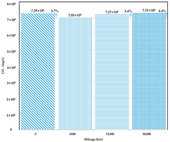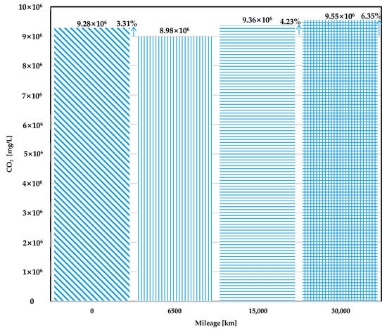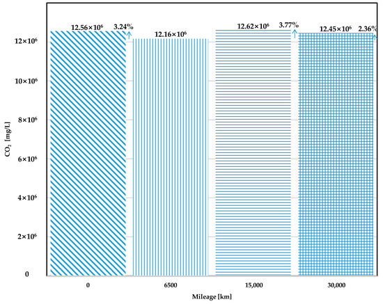 Figure 6 shows average CO2 concentration that was obtained from the test vehicle according to each mileage during FTP-75 cycle tests. The experiment was repeated twice, and the arithmetic mean of CO2 results calculated to reduce the effect on the change in CO2 emissions caused by the driving behavior. CO2 levels show differences by 3.24%, 3.77%, and 2.36% at 0 km, 15,000 km, and 30,000 km mileage, when compared with that at 6500 km mileage. In the case of the vehicle at 0 km mileage, CO2 emission was emitted slightly higher than that at the 6500 km mileage. Since taming of the vehicle at the initial driving of the vehicle usually results in poor fuel economy, it is assumed that CO2 concentrations at 0 km mileage were measured higher. While CO2 emission levels increased higher as compared with the result at 6500 km mileage as the engine ages, CO2 concentration levels at 30,000 km mileage were revealed to decrease when compared with that measured at 15,000 km mileage. This observation suggests increase in CO2 levels is driven by aging of the vehicle engine, as well as driving characteristics of the driver seem to have significant influence on increasing or decreasing CO2 emission even though the same vehicle travels along the same driving cycle. Also, it was shown that there is slight difference in total CO2 production when compared between 15,000 km and 30,000 km cumulative mileage. Since the total amount of CO2 emissions that are generated over the same driving cycle can be considered to be an indicator of fuel efficiency, there is assumed to be almost no variance in fuel consumption until at least 30,000 km after 15,000 km mileage over the FTP cycle. However, because all experiments in this study were conducted using a chassis dynamometer, a vehicle, and instruments for measuring exhaust gas, it was difficult to precisely identify why such results were reached without detailed modeling tools.
