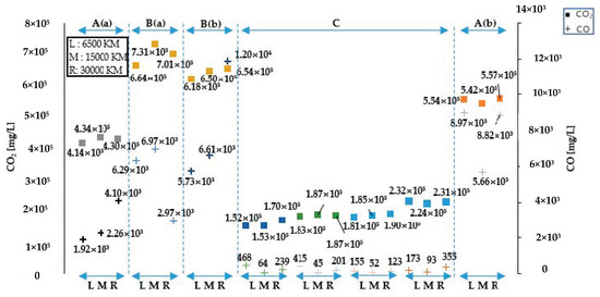 Figure 9 shows the velocity profile of the city mode in the US06 driving cycle. The speed profile is largely divided into three regions in terms of the relative magnitude of load applied to the engine. The regions of A, B, and C correspond to the areas wherein middle, high, and low load are applied to the engine, respectively. As mentioned previously, since the measurement of CO2 concentration levels made during one driving cycle is largely affected by driving behavior, specifically through instantaneous speed, all comparisons of changes in CO2 and CO due to aging of the engine were made from test data that revealed the most similar velocity profile in the time domain corresponding to rapid acceleration and deceleration regions among test data tested according to cumulative mileage of each vehicle.