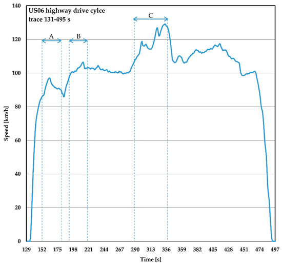 The US06 profile is shown in the Figure 3c. The driving cycle can be distinguished from other cycles in terms of the presence of frequent acceleration and deceleration regions. Characteristics of the cycle are a total distance of 12.8 km, average speed of 77.9 km/h, maximum speed of 129.2 km/h, and duration of 596 s. In addition, the US06 drive cycle can be divided into two regions, city, and highway mode.