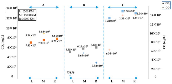 Figure 12 represents concentration of CO2 and CO measured during the A, B, and C regions in the highway mode of the US06 driving cycle. In the A regions, even though the vehicle was preconditioned to some extent, which makes the engine warmed up, an increase in CO2 emissions was observed as the vehicle’s cumulative mileage mounts. For the same reason as the cause of the result shown in the (a) part of the B region in the city mode, this result can also be interpreted that, regardless of engine temperature, fuel economy deteriorates in the aging engine when the engine is subjected to relatively high load. In the remaining B and C regions of highway mode with similar operating condition as in the (b) part of the B region in city mode, CO2 and CO emissions increase as the cumulative driving distance of the vehicle mounts, for the same reason as that shown in the (b) part of the B region. When considering the results of CO2 and CO emissions measured during acceleration regions in the city and highway modes, the results show that temperature of the engine, whether the load is applied on the engine at high rpm or stationary state and how much load is applied to the engine are the factors affecting aggravation of fuel efficiency due to increased vehicle’s cumulative mileage. In addition, as a result of examining growth rate of CO2 as the engine ages in the urban and highway areas of the US06 driving cycle, it was confirmed that the rate of increase of CO2 emissions was the highest when acceleration was performed while the vehicle was running. Based on these results, it is estimated that the aged engine has the greatest adverse impact on fuel economy when the vehicle is loaded at high speed.