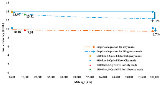 As observed in the Figure 13, it can be confirmed that there is slight difference in results between fuel efficiency obtained by the empirical formula, and those that were obtained by Equation C at the 6500 km and 15,000 km mileage. Through the empirical formula, approximately 6.7% difference between the fuel consumption at 6500 km mileage calculated from Equation C, and that produced from the empirical formula at 100,000 km mileage for city mode, is shown, while 11.5% difference was confirmed in fuel efficiency for the highway mode. Even though the absolute values of fuel consumption at 100,000 km mileage are invalid, it can be ascertained that when the vehicle is driven at the specific type of driving in the highway mode of US06 driving cycle wherein the engine is taking load at high rpm, fuel efficiency would deteriorate severely. This result is consistent with what was revealed in the above section.