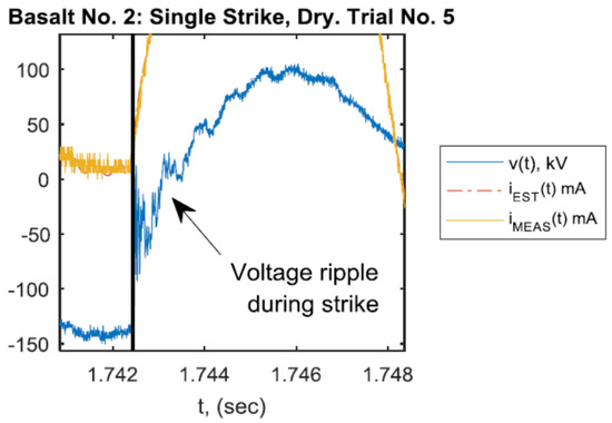 Voltage and current waveforms were measured on the primary (440 V) side with a sampling frequency of fs = 250 kHz. With the ideal transformer assumption, the measured current Ip as referred to the secondary (rock side) of the transformer is where a = 341 was the turns ratio of the transformer. The measured voltage V referred to the secondary side is , and the voltage across the rock is where R = 233.1 kΩ was the series resistance placed to limit fault current.