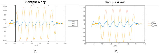 Example voltage and current waveforms for dry and let experiments: (a) data from sample A1 (dry), and (b) data from sample A3 (wet). The peaks of the current waveforms were reconstructed using cubic spline interpolation.