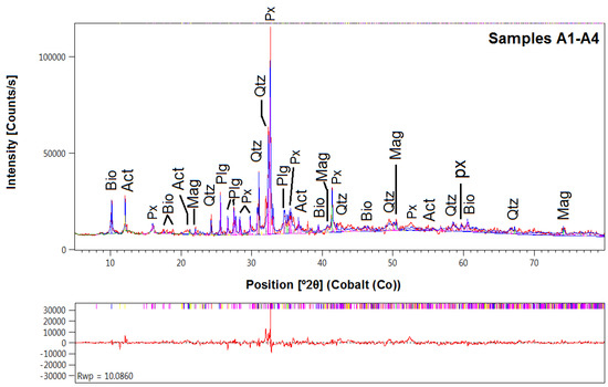 X-ray diffraction pattern of samples A1–A4. Px = pyroxene; Plg = plagioclase; Qtz = quartz; Mag = magnetite; Bio = biotite; Act = actinolite. Observed spectra (red line), fitted spectra (blue solid line), difference plot (below spectra), and Bragg peak positions (tick marks above difference plot) are shown. The weighted R-factor, Rwp, was calculated using the observed and calculated intensities in the powder diffraction patterns.