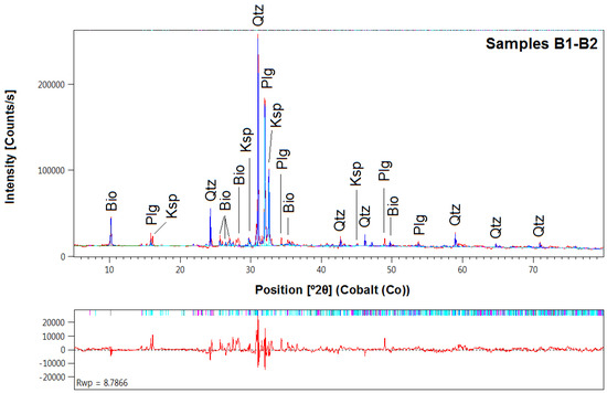 X-ray diffraction pattern of the samples B1–B2. Qtz = quartz; Plg = plagioclase; Ksp = K-feldspar; Bio = biotite. Observed spectra (red line), fitted spectra (blue solid line), difference plot (below spectra), and Bragg peak positions (tick marks above difference plot) are shown. The weighted R-factor, Rwp, was calculated using the observed and calculated intensities in the powder diffraction patterns.