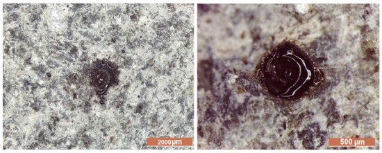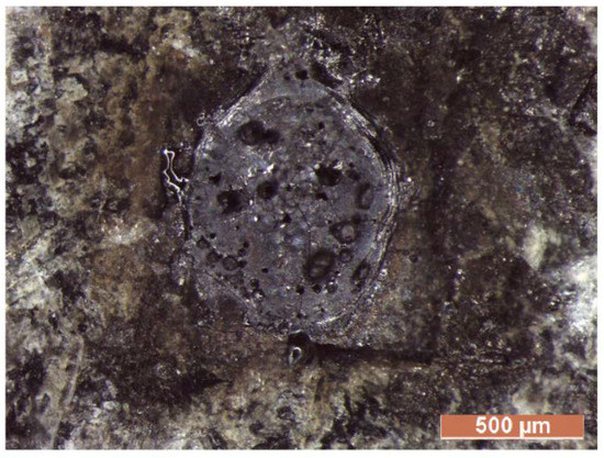 For the first law of thermodynamics for closed systems, energy transferred across the boundary of a system in the form of heat always results from a difference in temperature between the system and its immediate surroundings and a change of internal energy of the system. Due to the mechanical imbalance between the high-temperature air around the lightning channel and the air surrounding the rock, the former expands, vaporizing the rock at its contact and producing a crater on the rock surface. These effects were observed via optical microscopy on testing sample A0 (Figure 7) and basalt samples A1–A4, which show millimeter-size craters surrounded by glass (Figure 8, Figure 9 and Figure 10).