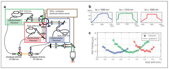 We used optical design software (Optics Studio; Zemax LLC, Kirkland, WA, USA) to design the chromatic aberration of the microscope optics. A 10X OCT scan lens (LSM02; Thorlabs, Newton, NJ, USA) was used as an imaging objective, before which two lenses (49-116; Edmund Optics, Barrington, NJ, USA) were inserted in infinite conjugate configuration to induce additional chromatic shift. The achieved displacement of the focal planes was confirmed experimentally by measuring the transverse point-spread function (PSF) using 5 m microspheres (4K-05; Thermo Fisher Scientific, Waltham, MA, USA) dispersed in an agarose gel. At a given depth plane, the microspheres were manually located, and the PSF diameter was measured as the full width half maximum (FWHM) of the peak amplitude. The median of the PSF width is plotted as a function of depth in Figure 1c. The induced focal shifts relative to the 1310 nm band was calculated by fitting the measured PSFs to a quadratic. The shifts of the 1060 nm band and 1550 nm bands (relative to 1310 nm) were 0.352 mm and 0.396 mm, respectively.
