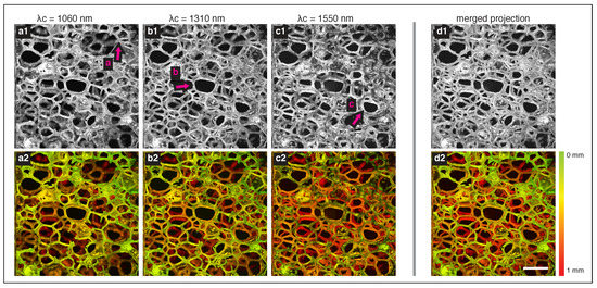 Projection images of polyurethane sponge. (a–c) MIP of the imaged volume from the individual interferometers where the source spectrum is centered at 1060 nm, 1310 nm, and 1550 nm, respectively. The arrows (a–c) highlight the in-focus depth in the imaging field. (d) MIP of the merged volume. The first row shows MIPs in grayscale, and the second row shows colorized MIPs with pseudo-colormap encoding the depth. Scale bar = 1 mm.