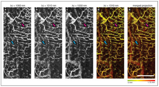 The vascular projections acquired from the bands centered at (a) 1060 nm, (b) 1310 nm, and (c) 1550 nm are shown. Projections were obtained using a colormap to encode the depth of the vessel, in (d) imaging band at 1310 nm, and (e) combining all three imaging bands. The magenta arrows mark the superficial vessel that is best captured by the 1060 nm system. The blue arrows mark the deeper vessel that is best captured by the 1550 nm system. Scale bar = 1 mm.
