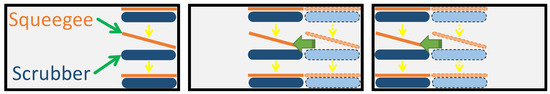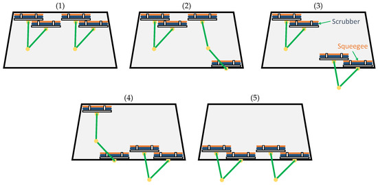 In order to design an efficient façade cleaning robot, it is critical to (1) clean the window from top to bottom and (2) move the squeegee to track the scrubber, as shown in Figure 1. The design challenges involved in these key points are discussed in this section. The basic strategy is to resolve functions to achieve each key point as an individual design/control issue. Figure 2 shows a solution for window size and window shape for terrain adaptability. The solution is a biped system and consists of individual legs. The developed system extends its cleaning area and is controlled in a coordinated way. If the window shape is changed, it is able to adapt by extending the cleaning area of each individual leg. Additionally, Figure 2 shows the technique of the scrubber and the squeegee. The solution consists of a swarm control system to control the robots systematically. The swarm control system has high adaptability, as shown in Reference [35]. Patil et al. designed and implemented a UB swarm robot system consisting of five robots that are heterogeneous in sensory units, microcontroller, functionality, and size [36]. Our proposed swarm robot system consists of multiple biped robots equipped with a cleaning unit on each robot’s foot so that each robot can move from top to bottom and that the squeegee is installed next to the scrubber. Keeping the squeegee in contact with the glass surface during cleaning is a control issue of the robot. Additionally, cleaning in one direction is a transition plan of the developed robotic system as well. Thus, the challenges regarding the hardware and software are listed as follows: