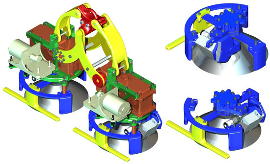 Figure 3 is a CAD design of the biped robot. Each foot unit includes a cleaning unit, a suction cup, a vacuum pump, a seal mechanism, a valve to break vacuum, and servo motors for joint actuation. The morphology adopts a parallel linkage mechanism that keeps the foot unit of the robot and the glass surface parallel without any control system. That is, since the degree of freedom of the system is able to be decreased, the number of actuators for locomotion can also be decreased. Hence, adopting a parallel linkage mechanism provides an advantage in terms of weight saving. Weight saving is important because it allows one to decrease the amount of energy needed to maintain the robot’s weight. The area of both the adhesion/sealing mechanism and the driving mechanism are separated. This separation provides two advantages: the driving range in the rotational direction is extended, and maintenance is easy. Since only one attachment is required between each part, hardware updates in the future will be easy. Support parts, such as legs, can be installed onto the adhesion component. The support parts are pushed to the glass surface when the suction cup is in vacuum mode. This makes the robot robust against glass surfaces.