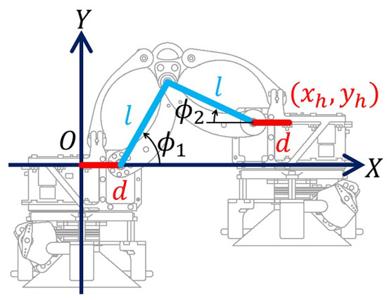 Figure 4 shows a schematic figure of the designed robot. The designed robotic system can be supposed as a simple two-link manipulator in a vertical plane on the arm. The origin is set on the center of the supporting leg, and the center of the idling leg is