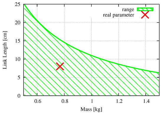 From Equation (4), if rad, the required torque becomes maximum. Since the stall torque of the servo motor is 3.7 Nm from Table 1, the driving torque is 1.23 Nm with a safety factor of 3. The relationship between link length and the weight of the foot unit is shown in Figure 9. From Figure 9, “×” highlighted in red represents the actual design parameter, and it satisfies Equation (4). Thus, RX-28 is able to generate enough driving torque as a base actuator.