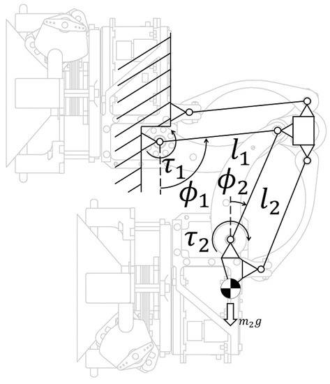 From Equation (3), if rad, the required torque becomes maximum. Since the stall torque of the servo motor is 8.4 Nm from Table 1, the driving torque is 2.8 Nm with a safety factor of 3. The relationship between link length and the weight of the foot unit is shown in Figure 7. From Figure 7, “×” highlighted in red represents the actual design parameter, and it satisfies Equation (3). Thus, MX-106T is able to generate enough driving torque as a base actuator. Regarding the base actuator, if , the required torque for driving [Nm] is obtained by Equation (4), based on a simplified model shown in Figure 8.
