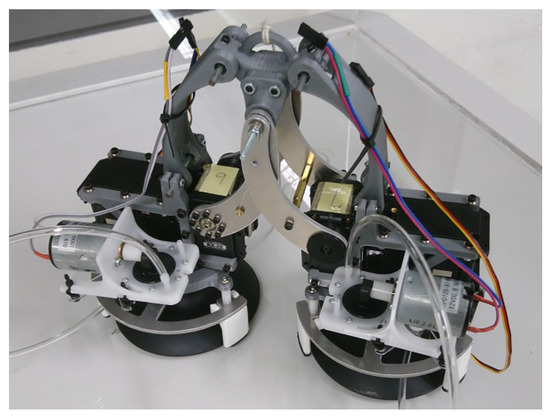 To overcome such issues, research on glass façade cleaning robots has been reported. For example, a series of Skycleaners, which are entirely driven by pneumatic actuators, has been developed to move and clean on the glass wall by utilizing vacuum suction cups [12,13]. The Skycleaner is installed with suction cups on both ends of the actuators in an X–Y stage, and these suction cups are connected to a vacuum pump [14]. Sun et al. developed a wall climbing robot with an X–Y stage mechanism as well as a rotational joint and demonstrated the effectiveness of the developed robot and the proposed strategies through field trials at both the City University of Hong Kong and the British Broadcasting Corporation (BBC) [15]. The efficacy and validity of the developed system has been demonstrated through a range of experiments [16]. Serbot AG, an industrial company in Switzerland, developed a wall and solar panel cleaning robot called GEKKO [17]. GEKKO is equipped with a vacuum suction cup crawler which rotates horizontally. The crawler has a semi-circular shape and has a straight line on one side and an arc line on the other side, through the use of which both linear and rotational motions are realized. By changing the number of brushes and crawlers, the developed robot can be manually reconfigured to adapt to different wall areas. Seo et al. developed ROPE RIDE [18]. ROPE RIDE enables one to climb up a vertical surface by utilizing a rope dropped down from the top of the building, two additional propeller thrusters are installed to securely adhere to the wall. A cleaning unit for a cleaning wall has been installed [19]. A new impedance control system has been proposed, and the effectiveness of the force control system to press brushes to the wall with a constant force has been shown through an experiment [20]. SIRIUS is a wall cleaning robot developed by Fraunhofer IFF, which is an industrial company in Germany [21,22,23,24]. SIRIUS realizes up-and-down motion by utilizing a crane installed on buildings for façade maintenance. It adheres to the wall by a suction system which locomotes like a linear actuator [25,26,27]. Ceplina et al. developed a wall climbing robot capable of spraying different cleaning and disinfecting liquids in hospital and clinic nursing environments assuming a full flat wall surface [28]. Akinfiev et al. developed a climbing cleaning robot hanging down from a crane. They prototyped the robot and demonstrated its effectiveness via experiments in real conditions [29]. The methods of the literature are effective and valid, as shown by the experimental results. Even though numerous studies in the literature have demonstrated the use of glass façade cleaning robots, conventional platforms experience a system failure with respect to area coverage, which degrades their full efficiency. One major factor in glass façade structures that affects the performances of façade cleaning systems is the frames that connect the two glass panels. These frames generally act as a barrier for glass façade cleaning robots to cross over from one glass panel to another, which leads to a performance degradation in terms of area coverage. One viable approach to overcome these difficulties in façade structures is to develop a façade cleaning system with a biped mechanism that can overcome these obstacles.