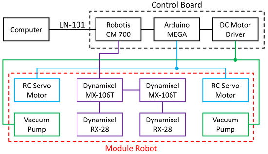 Figure 13 shows a system architecture for the experiments. From Figure 13, the system mainly consists of a laptop computer for the target position indication, the biped robot, and a control board. Since the robotic system is suspended on a rope for safety purposes, the control board and power supplies such as the safety rope can be installed externally. CM-700 produced by Robotis is the main computer and performs the communication between the components and trajectory calculations. The RC servo motor and the vacuum pump for the vacuum system are controlled by Arduino MEGA 2560 via the receiving of control signals from CM-700. A power supply (6 V) for driving the RC servo motor is installed on the control board, and the 12 V supply is delivered from outside via cable. In this paper, two experiments were performed to verify the effectiveness of both its normal locomotion and its ability to overcome obstacles.