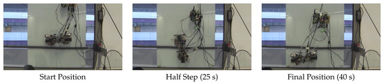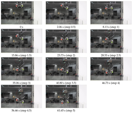 The experiment of normal locomotion aimed to demonstrate the motion performance of the biped robot. The key points are as follows: clean the window from top to bottom, move the squeegee to track the scrubber, keep the squeegee in contact with the glass surface while cleaning a column, and clean in one direction. Snapshots and graphs of the experiment of normal locomotion with time variation are shown in Figure 14 and Figure 15.