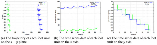 The graph of the normal locomotion experiment. (a–c) are the graphs of numerical data related to the normal locomotion between five steps. The origin was set on the initial left foot unit marker.