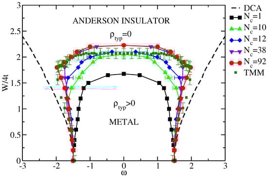 - Sen, S.; Terletska, H.; Moreno, J.; Vidhyadhiraja, N.S.; Jarrell, M. Local theory for Mott-Anderson localization. Phys. Rev. B 2016, 94, 235104. [Google Scholar] [CrossRef]