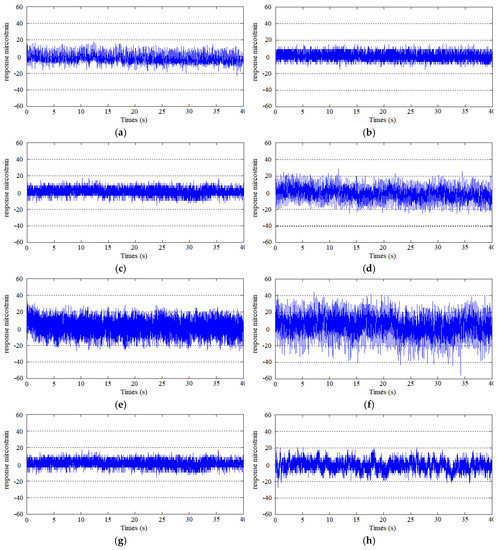 Generally speaking, the VIV responses of the riser in the flow direction and the cross-flow direction (90° with respect to the flow direction) are obviously different. In flow direction, the displacement is maintained at a relatively stable value, and vibrates slightly after the initial growth [35]. On the other hand, the vibration in the cross-flow direction of the riser is much more significant for the VIV study. It is noted that the cross-flow direction of the riser includes the separation and initiation of the wake and the shedding of vortices, and this fact significantly influences the initiation of the lock-in phenomenon. Moreover, the amplitude of vibration in the middle part of a riser is comparably lager than that at other locations. Therefore, the microstrain curves obtained from the strain gauges in the cross-flow direction (strain gauges ‘c’) at z = 0.5 m are utilized as a typical example presented in this paper.