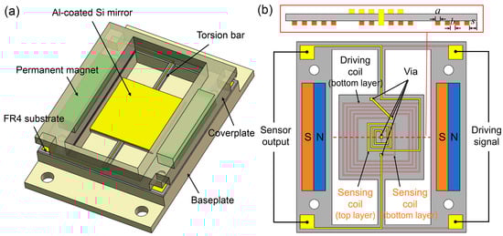 (a) Schematic drawing of the assembled FR4-based electromagnetic scanning micromirror integrated with angle sensor. (b) Layout of the integrated sensing coil in the FR4 platform.