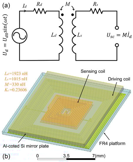 However, the angle sensor output voltage consists of not only the moving-induced electromotive force but, also, the coupling voltage coupled from the driving signal. The coupling effect of the driving and sensing coils can be described as a coupled inductor model, and its equivalent circuit model is shown in Figure 2a. The resistances of the driving coil and sensing coil are 3.7 Ω and 2.4 Ω, respectively. In order to better analyze the coupling effect and obtain the corresponding parameters, electromagnetic field finite element analysis (FEA) of the device is performed by using the Ansoft Maxwell simulation tool. All the material properties used in the simulation are from the material library of the software. The finite element model of the mirror consisting of the FR4 substrate, driving and sensing coils, and an aluminum-coated silicon mirror plate, is shown in Figure 2b, as well as the parameters obtained through magnetostatic analysis. We can see that the coupling effect is weak, due to the small coupling coefficient (Kc = 0.23606). According to our previous work, the current in the driving coil is much larger than that in the sensing coil. Thus, the coupling effect of the sensing coil on the driving coil can be neglected. We only need to analyze the coupling voltage in the sensing coil coupled from the driving signal.