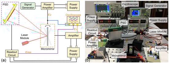 Figure 3a shows the schematic drawing of the measurement setup of the angle sensor. The micromirror works at the resonance point (361.8 Hz). The scan angle is controlled by adjusting the driving voltage amplitude, and can be calculated according to the length of laser scan line and the distance between the optical screen and the micromirror. The length of laser scan line can be measured accurately through a position sensitive detector (PSD). Meanwhile, the corresponding output signal of the angle sensor is amplified by a simple voltage amplifier with a gain of 400, and then measured using an oscilloscope. After this amplifier, the signal amplitude can reach a level of several hundred millivolts, which is large enough to be detected by the oscilloscope. The photograph of the real experimental setup is shown in Figure 3b. In order to measure the coupling voltage coupled from the driving signal, and keep the device virtually undamaged at the same time, we take away the magnets of the assembled micromirror, so that the mirror plate cannot move due to the absence of a magnetic field, and then excite the driving coil to see the output of the sensing coil.