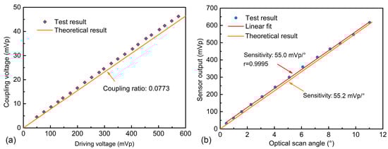 According to Figure 5b, we can see a clear linear relationship between the sensor output voltage and the optical scan angle of the micromirror. The correlation coefficient r can reach 0.9995. This is well consistent with the theoretical relation determined by Equation (13). The sensitivity of the angle sensor can be determined as 55.0 mVp/°, which is also very close to the theoretical value of 55.2 mVp/°, calculated by Equation (13). The difference between the experimental and theoretical values can be attributed to the process error. In addition, a little nonlinear behavior of the test result is observed in Figure 5b. It is caused by the coupling effect between the driving and sensing coils. By comparing Equation (9) with (13), we can find that the parameter of torsional stiffness K is introduced in Equation (13) when considering the coupling voltage in the sensing coil coupled from the driving signal. Owing to the nonlinear spring effect of the torsion bars [15,24], K is not a constant, but varies with the change of the scan angle. Thus, a little nonlinear behavior of the test result is observed. The theoretical result is perfectly linear because K is assumed to be a constant in the theoretical calculation.