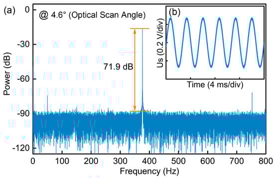 The frequency spectrum from 0 to 800 Hz (surrounding the 361.8 Hz) was measured to identify the signal-to-noise ratio (SNR) of the angle sensor. In this test, the sensor signal is recorded in the oscilloscope after going through the aforementioned amplifier and a fourth-order bandpass filter. Then, the frequency spectrum can be obtained through a fast Fourier transform of the time-domain signal. Figure 6a,b show the measured frequency spectrum at the optical scan angle of 4.6°, and the corresponding angle sensor output in time domain, respectively. This signal shows a great signal quality of 71.9 dB SNR, which is beneficial for feedback control.