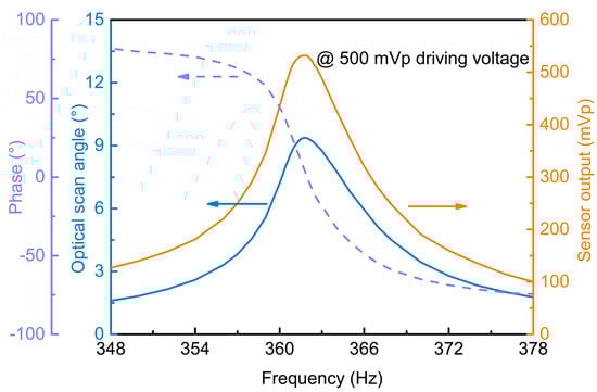 Figure 7 shows the frequency characteristics of the angle sensor compared to the optical scan angle obtained from PSD measurement. In the measurement, the micromirror is actuated by the sinusoidal sweep signal from 348 Hz to 378 Hz. The frequency response functions of the micromirror are measured by the angle sensor and PSD, respectively. We can see that two frequency response functions have almost the same overall profile, which means that the angle sensor can still work, even though the micromirror is off the resonance. In addition, the phase curve in Figure 7 shows that the phase of the sensor output voltage will change when the micromirror oscillates off the resonance. Therefore, the resonance can be tracked by monitoring the phase difference between the sensor output and driving signals, i.e., a phase-lock loop [21].