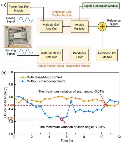 Based on the great angle sensor signal quality, a simple closed-loop control circuit was developed to further verify the sensor’s good feasibility for feedback control. Figure 8a demonstrates the closed-loop control scheme. The micromirror is actuated to oscillate around the torsion bars by the sinusoidal driving signal. Meanwhile, the generated sinusoidal angle sensor signal, depending on the deflection angle of the micromirror, is detected by the angle sensor signal acquisition module. After going through the rectifier-filter module, the signal is converted to a DC voltage signal. To stabilize the deflection angle, the amplitude gain control module was introduced. The signal of the voltage difference between the DC voltage, representing the deflection angle and the reference voltage signal, is input to the module. Then, the amplitude gain control is mainly accomplished by multiplying the voltage difference with the sinusoidal signal generated by signal generation module. Therefore, the amplitude of the driving signal can be regulated in real time according to the feedback signal of the integrated angle sensor.