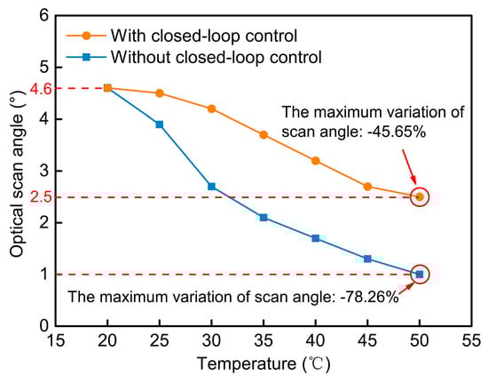 Finally, temperature stabilities of the micromirror, operated both with and without closed-loop control, were also tested. In this test, the micromirror is placed in a high and low temperature test chamber. The temperature is increased from 20 to 50 °C in increments of 5 °C under atmospheric pressure. The test result is shown in Figure 9. With the change of temperature, the resonant frequency of the device varies, and the micromirror will work off the resonance [21,25]. Hence, we can see that the optical scan angle decreases with the increase of temperature. Without closed-loop control, the optical scan angle decreases from 4.6° to 1° as the temperature rises from 20 to 50 °C. On the other hand, with closed-loop control, the optical scan angle decreases from 4.6° to 2.5°. By comparison, the micromirror operated with closed-loop control possesses relatively better temperature stability. It indicates that the feedback control, based on the integrated angle sensor, is workable and is beneficial to improve the micromirror’s temperature stability. However, due to the limited adjustable voltage range of this analog closed-loop control circuit, and the lack of tracking-resonance function, the maximum variation of scan angle still reaches 45.65%. Therefore, it is highly desirable to develop a more precise digital closed-loop control circuit that can regulate the amplitude and frequency of the driving signal in follow-up work.